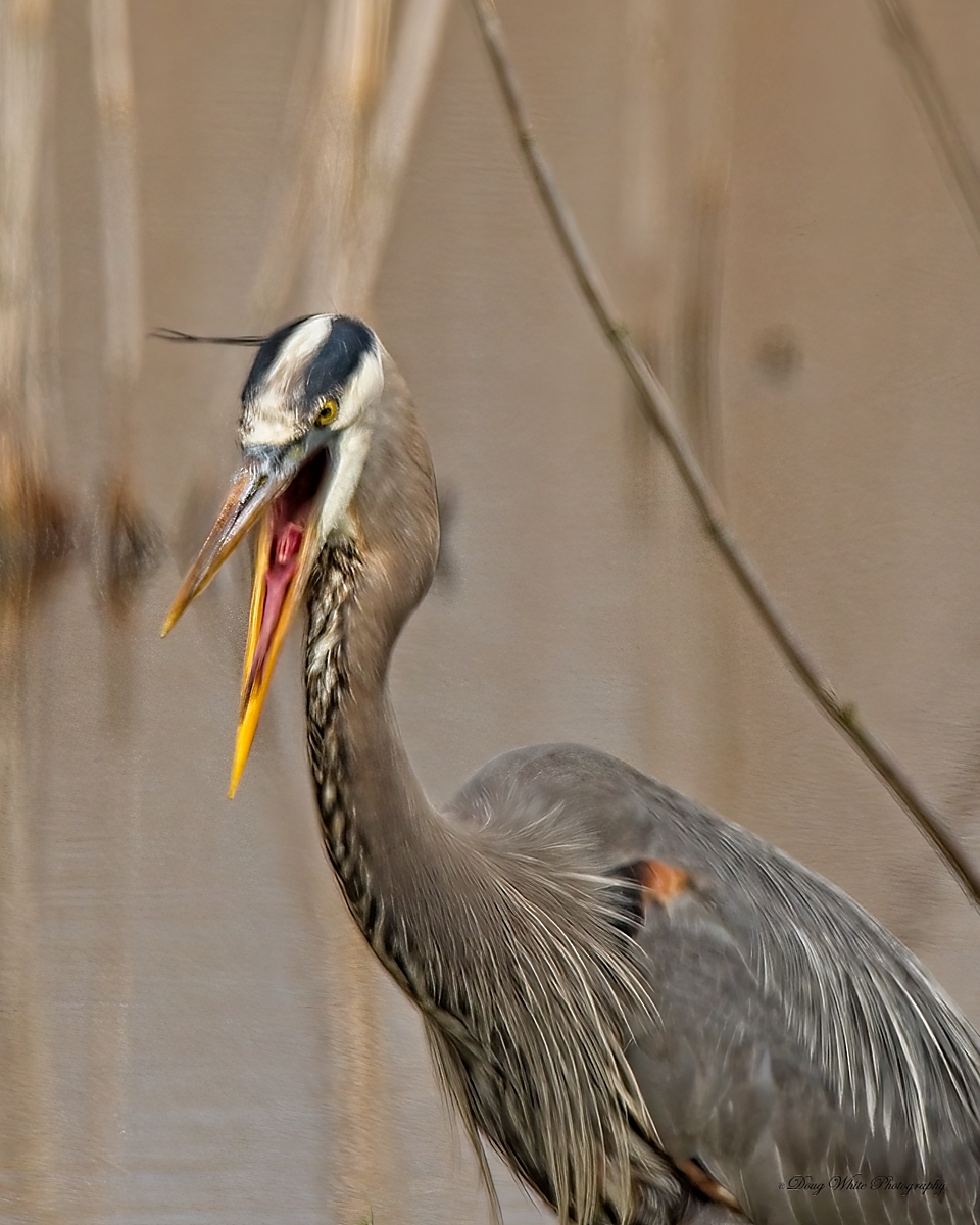 A few more shots of the great blue heron. The first shot would not be one I would typically share. It is badly blurred but it is the only one I have showing the similarity of a bird to a snake with the breathing tube away from where prey are swallowed. There must be a common lineage in there somewhere! The second photo is striking a pose on a good hair day. Enough of that, it's time to get back looking for food stretching my long neck to see any motion better.